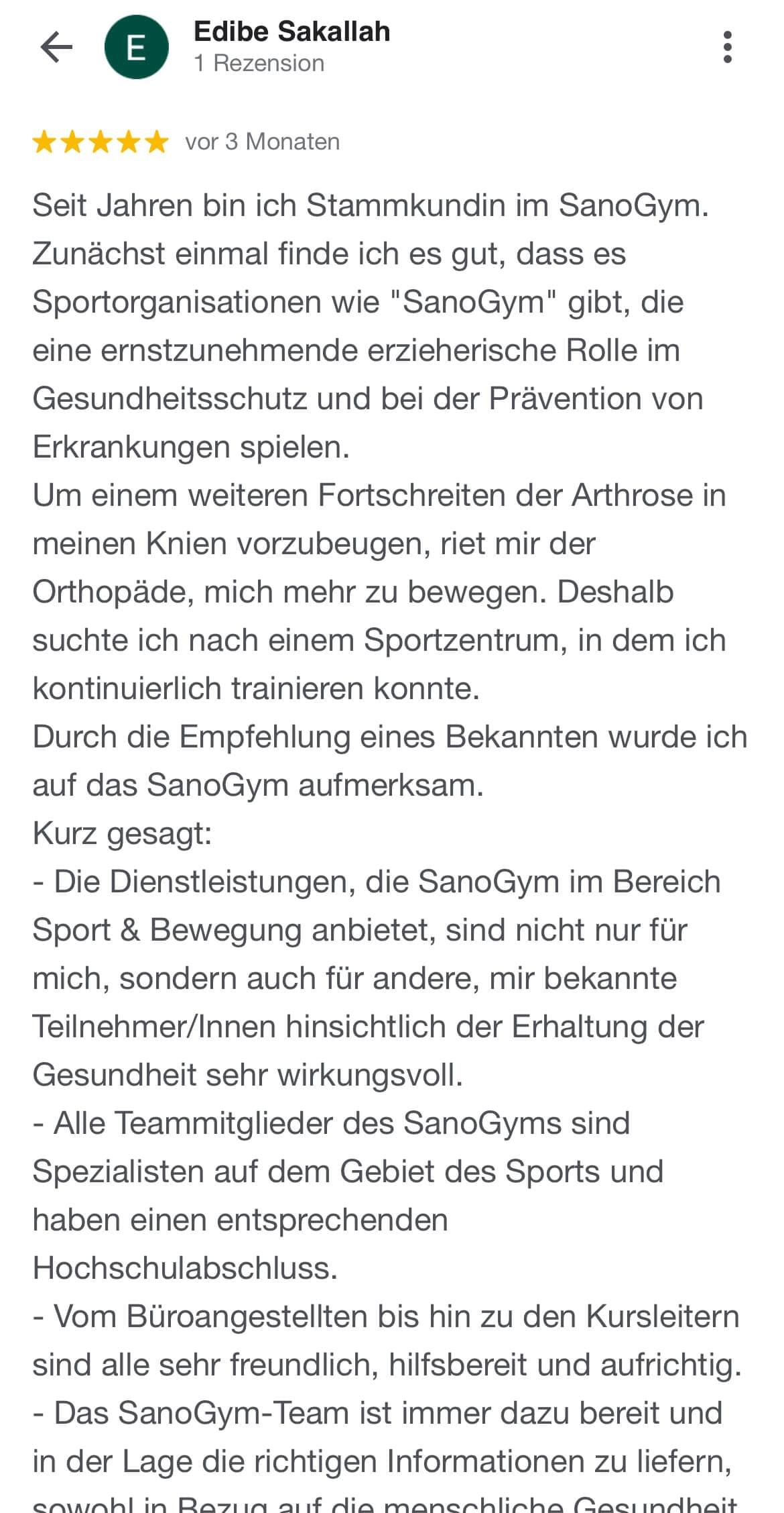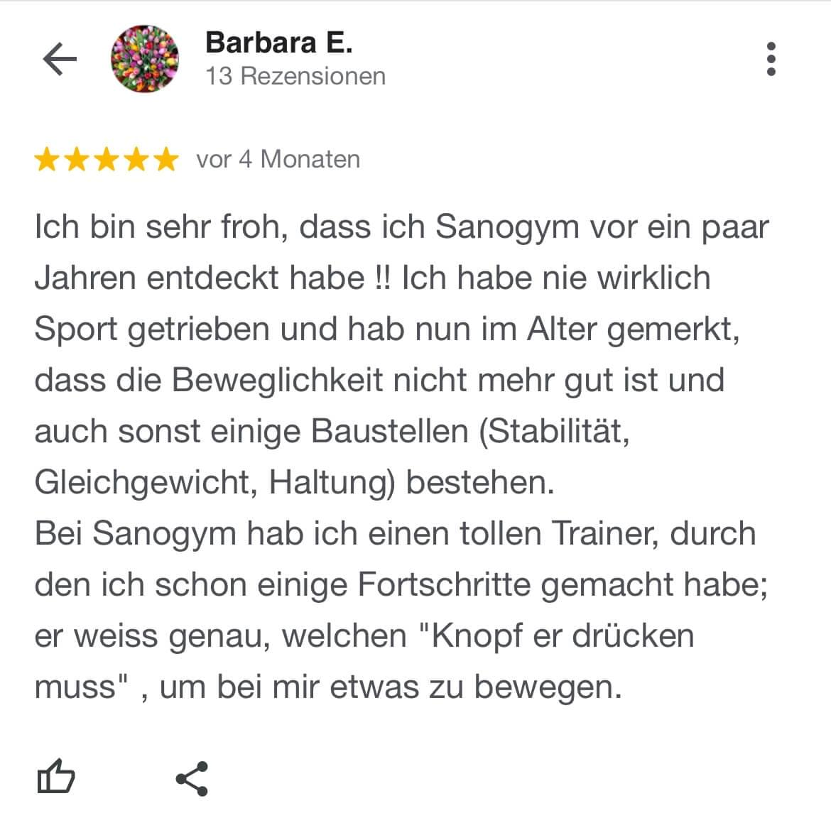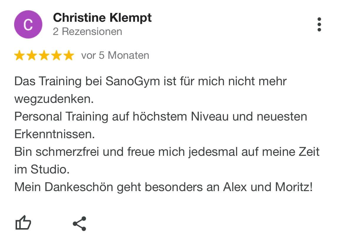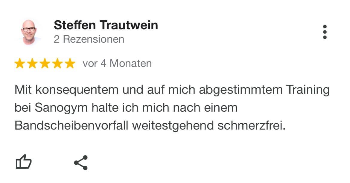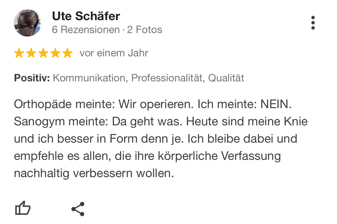 "Ich kann SanoGym jedem empfehlen, der ein orthopädisches Problem hat und seinen Körper mit Spaß und kompetenter Begleitung wieder regenerieren möchte. SanoGym hat mir selbst nach meinem Bandscheibenvorfall geholfen, meine Angst vor Schmerz zu überwinden und meinen Körper wieder selbst in die Hand zu nehmen."