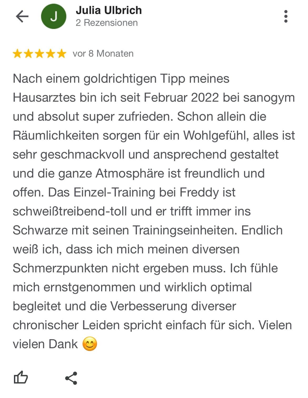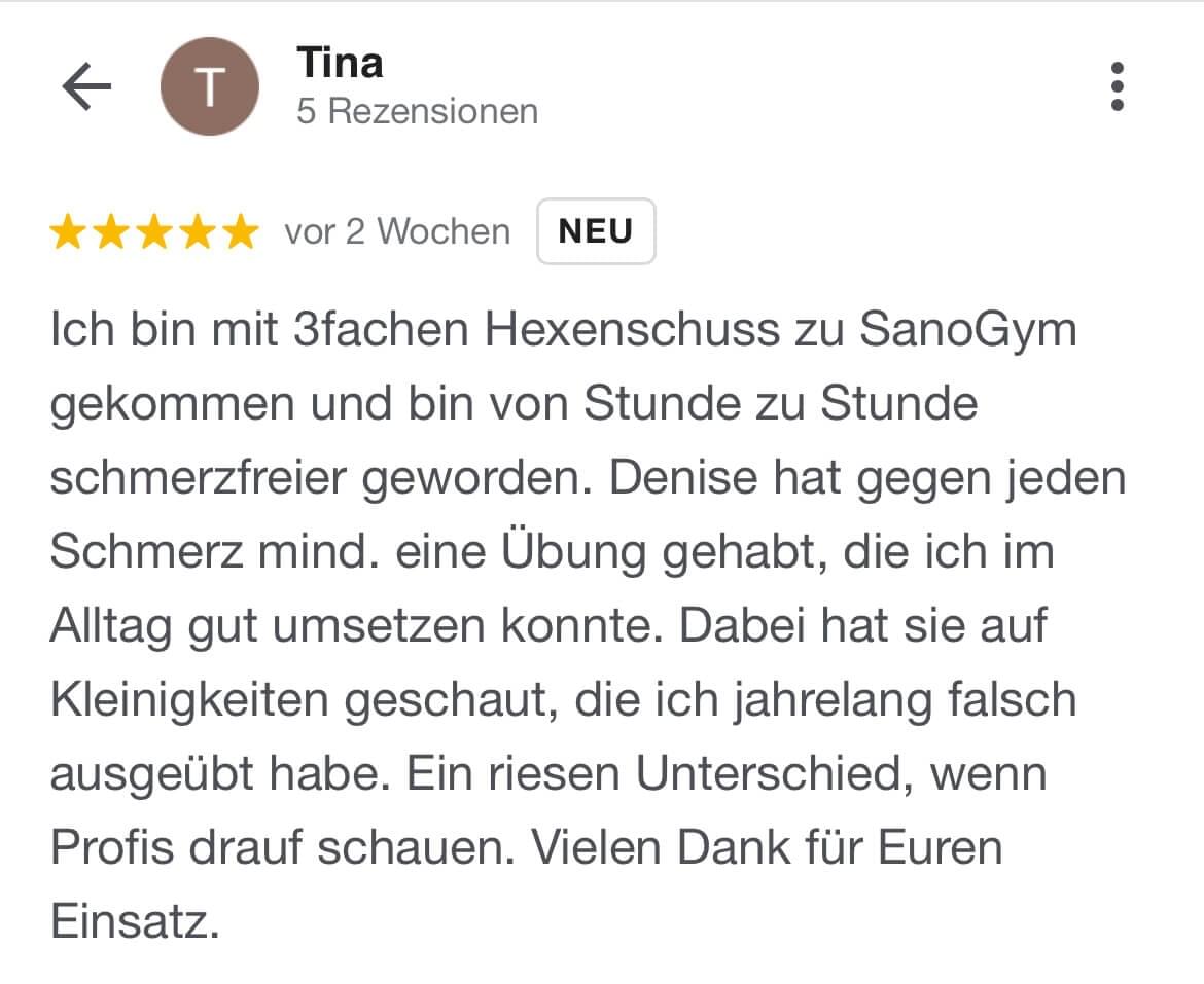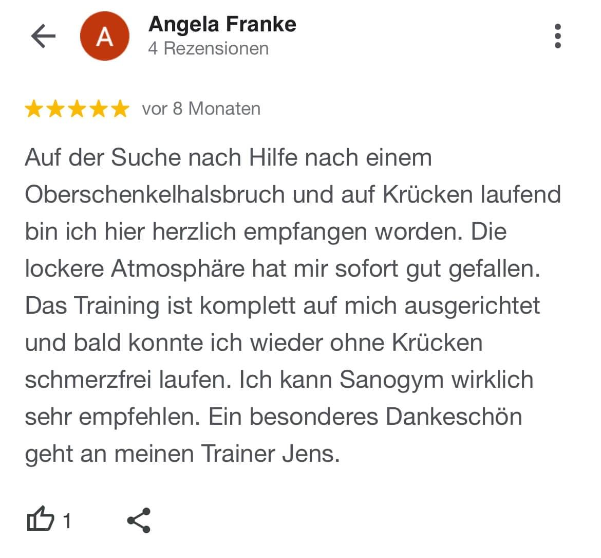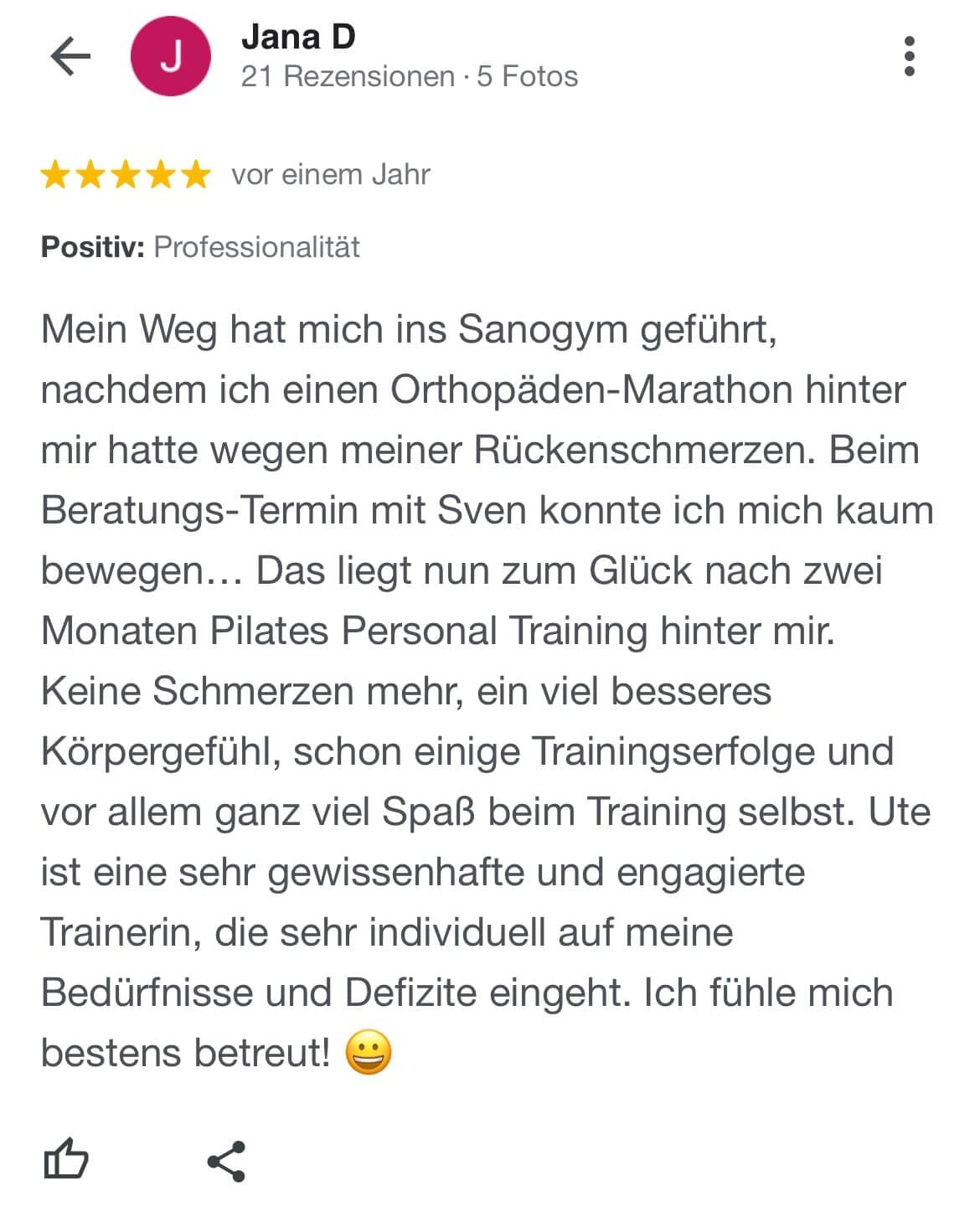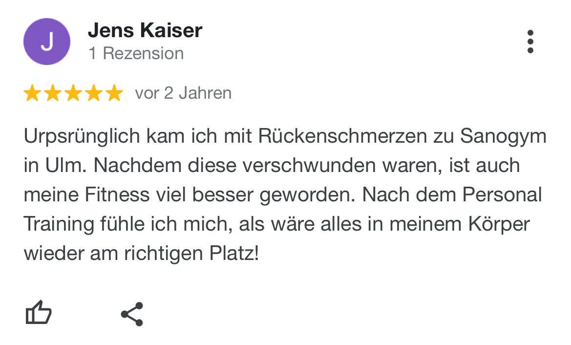"Ich kann SanoGym jedem empfehlen, der ein orthopädisches Problem hat und seinen Körper mit Spaß und kompetenter Begleitung wieder regenerieren möchte. SanoGym hat mir selbst nach meinem Bandscheibenvorfall geholfen, meine Angst vor Schmerz zu überwinden und meinen Körper wieder selbst in die Hand zu nehmen."
