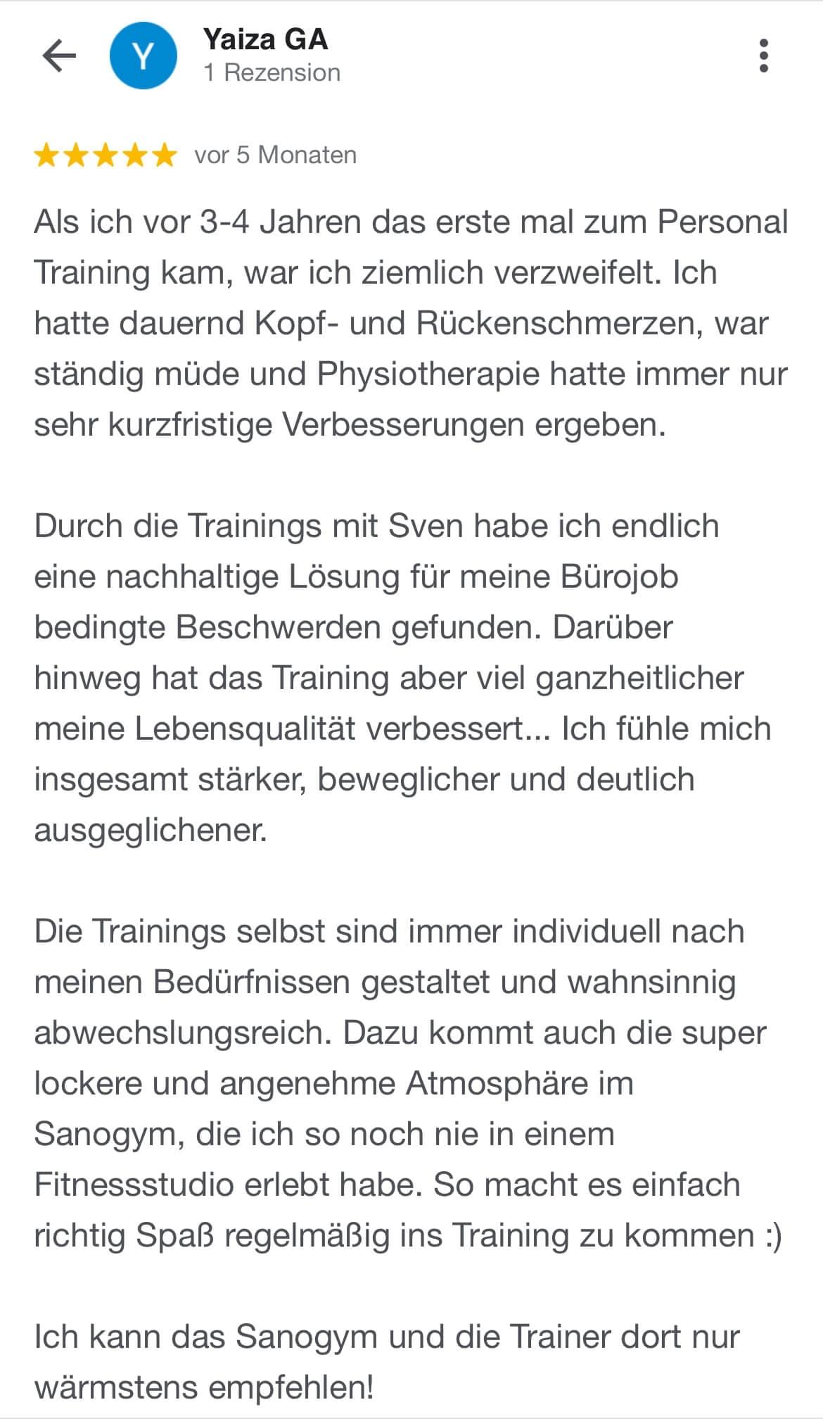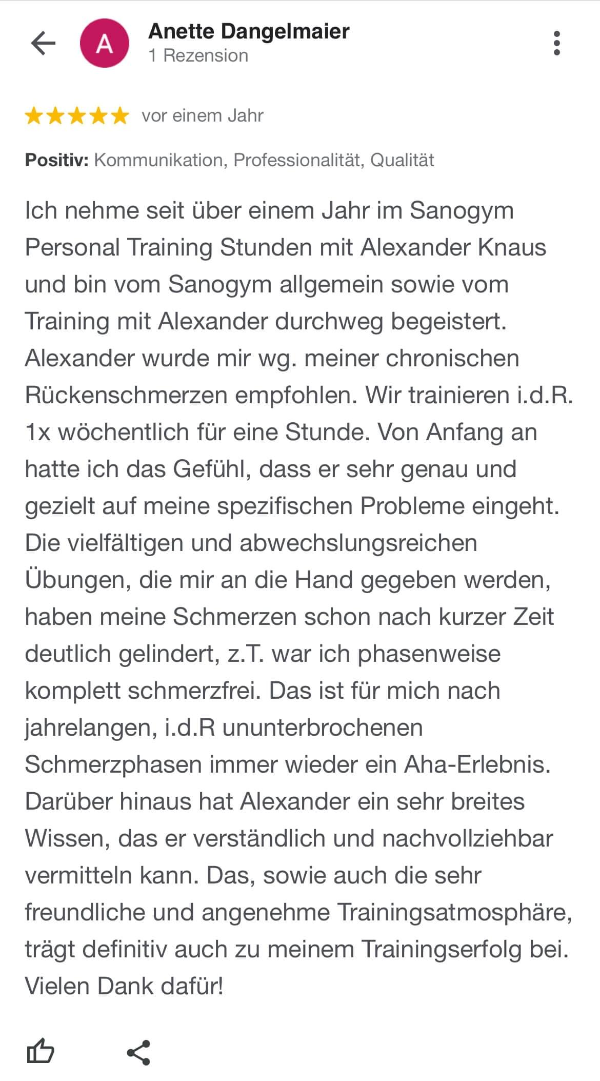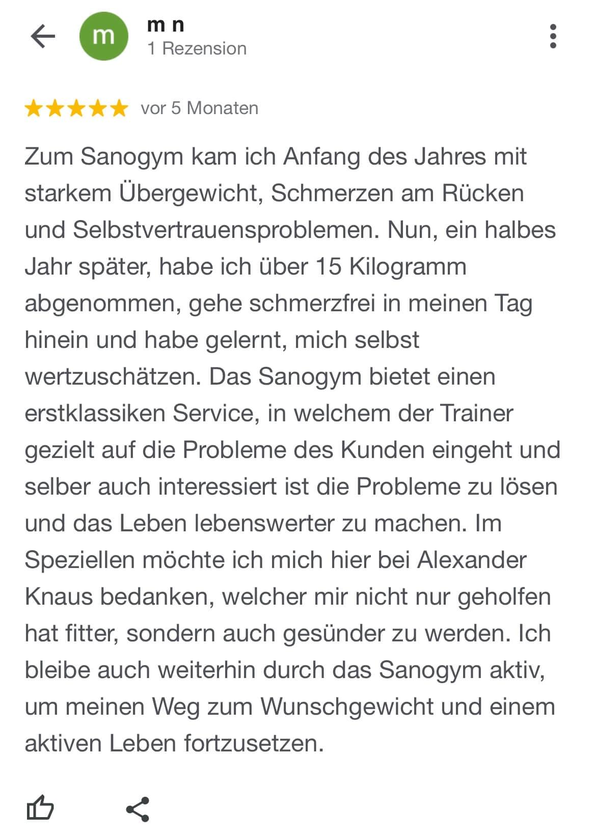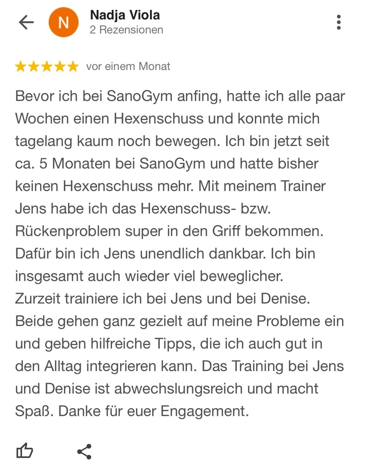 "Ich kann SanoGym jedem empfehlen, der ein orthopädisches Problem hat und seinen Körper mit Spaß und kompetenter Begleitung wieder regenerieren möchte. SanoGym hat mir selbst nach meinem Bandscheibenvorfall geholfen, meine Angst vor Schmerz zu überwinden und meinen Körper wieder selbst in die Hand zu nehmen."