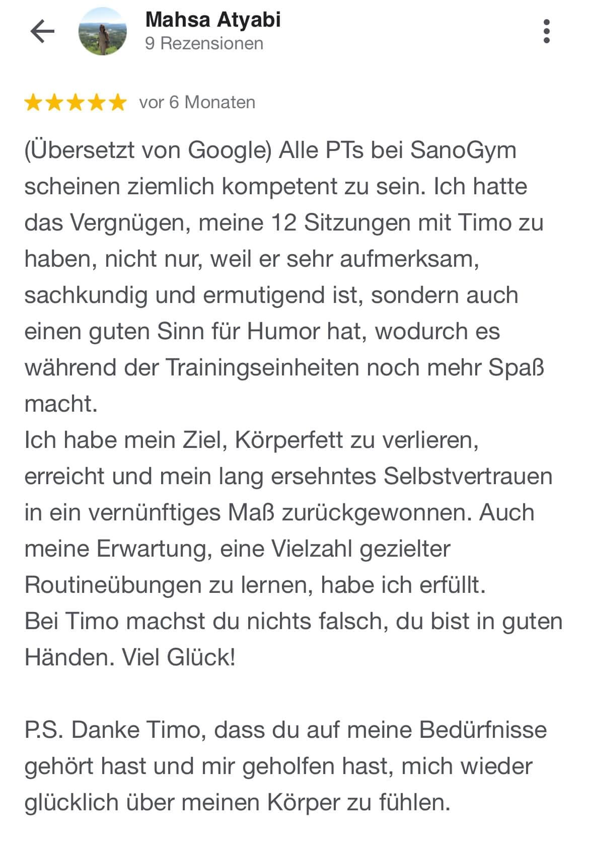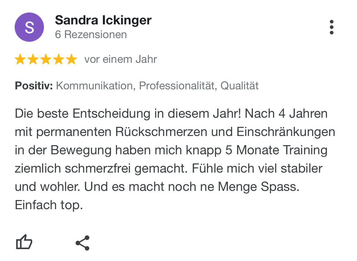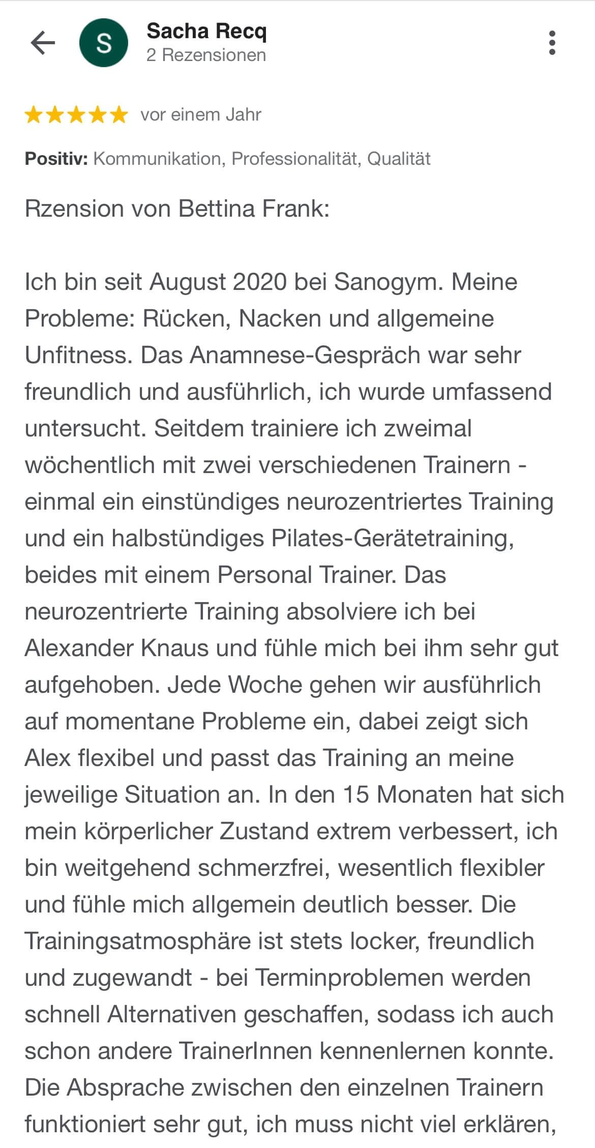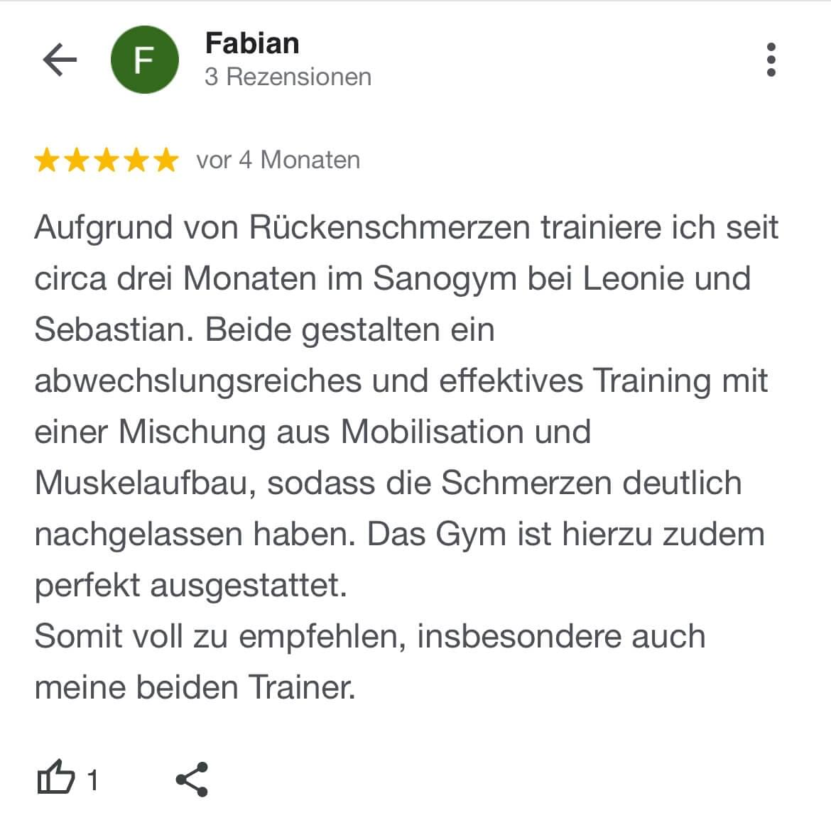 "Ich kann SanoGym jedem empfehlen, der ein orthopädisches Problem hat und seinen Körper mit Spaß und kompetenter Begleitung wieder regenerieren möchte. SanoGym hat mir selbst nach meinem Bandscheibenvorfall geholfen, meine Angst vor Schmerz zu überwinden und meinen Körper wieder selbst in die Hand zu nehmen."