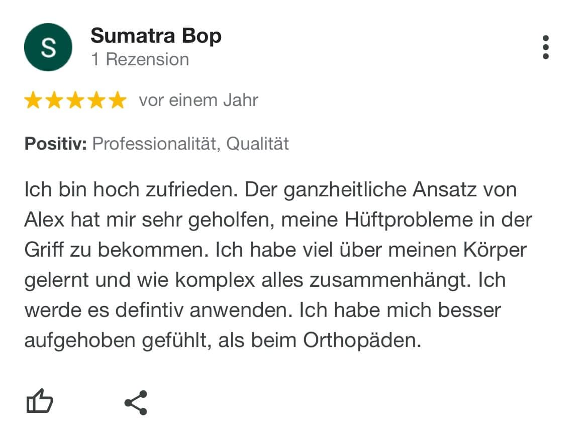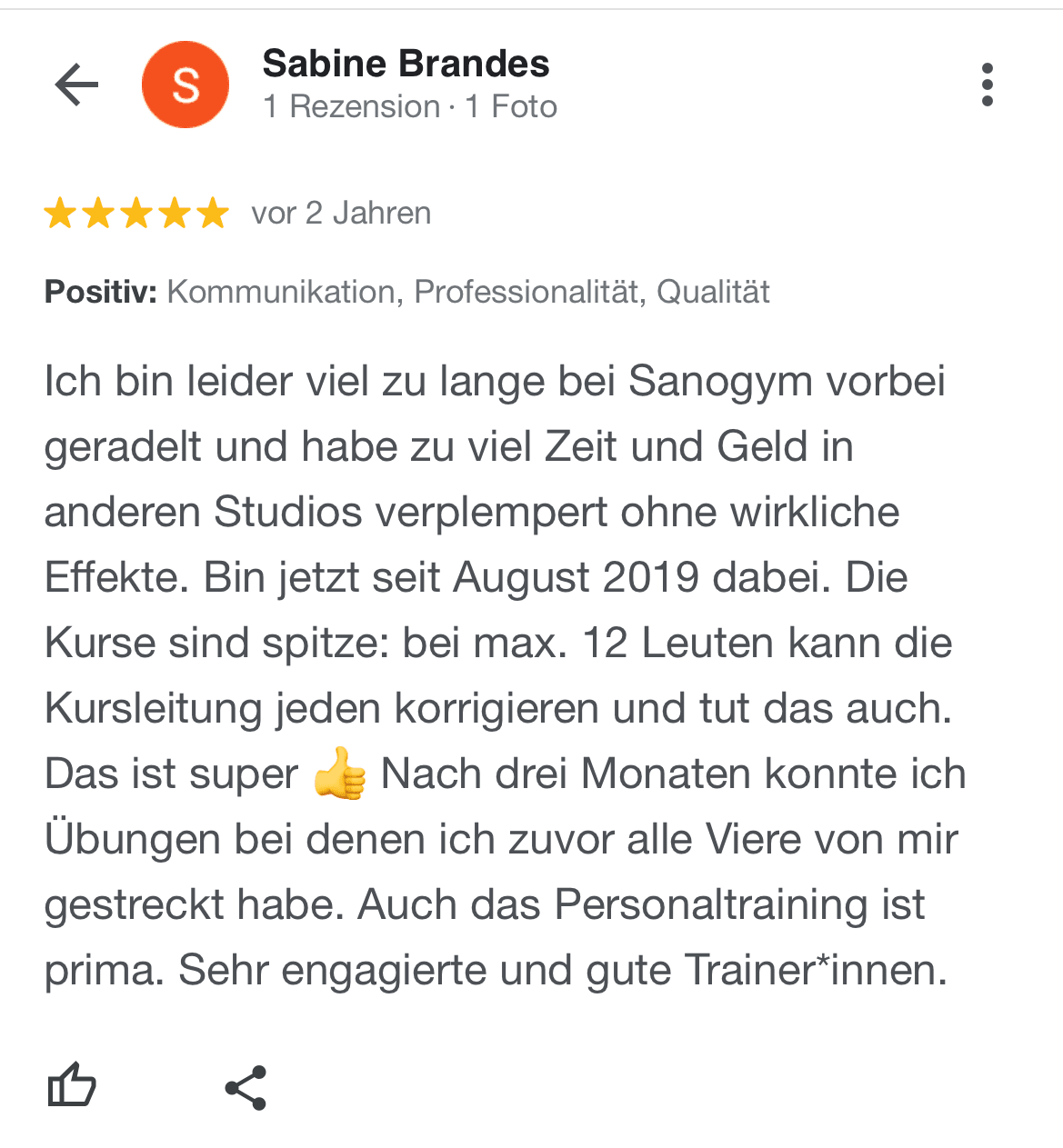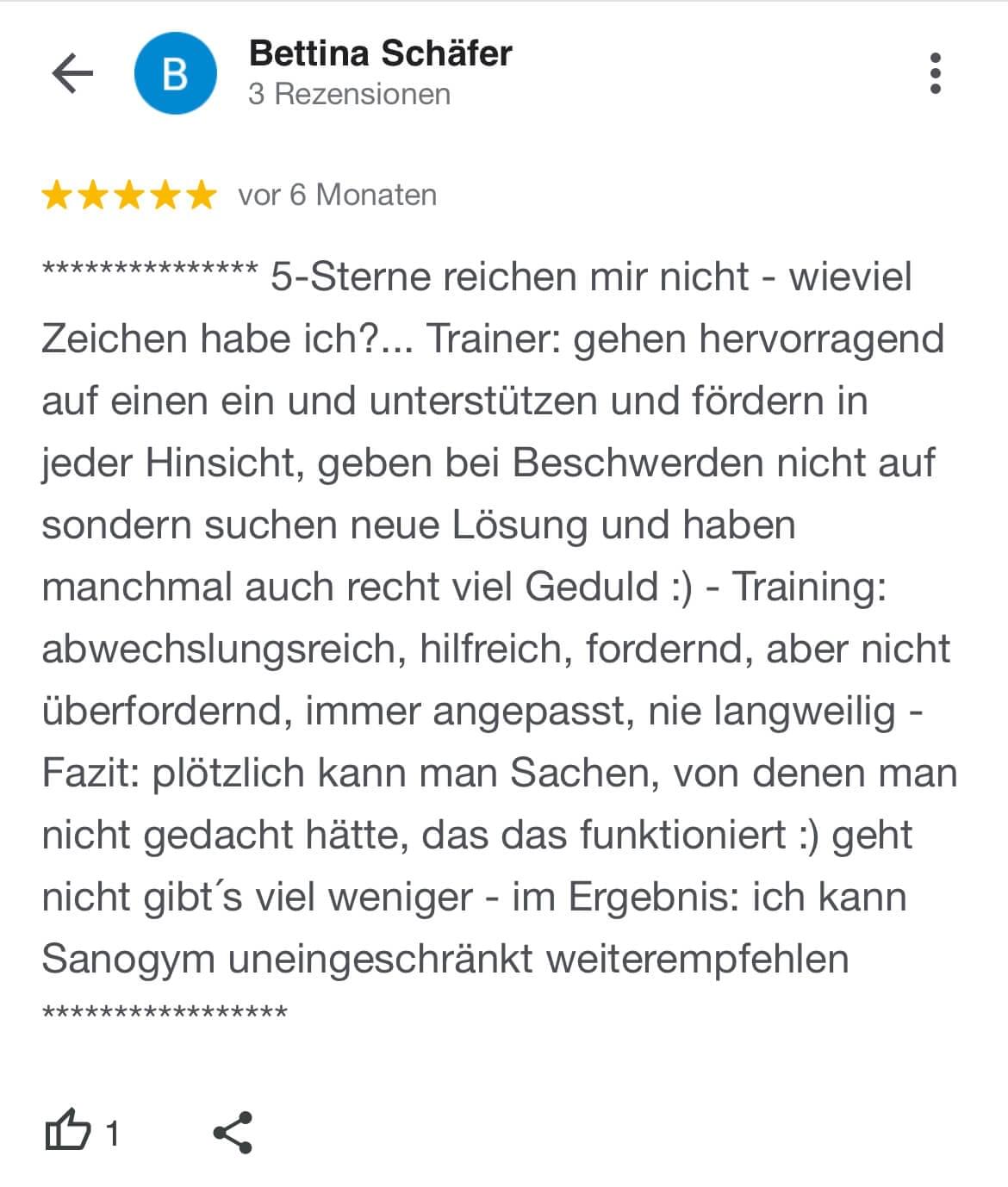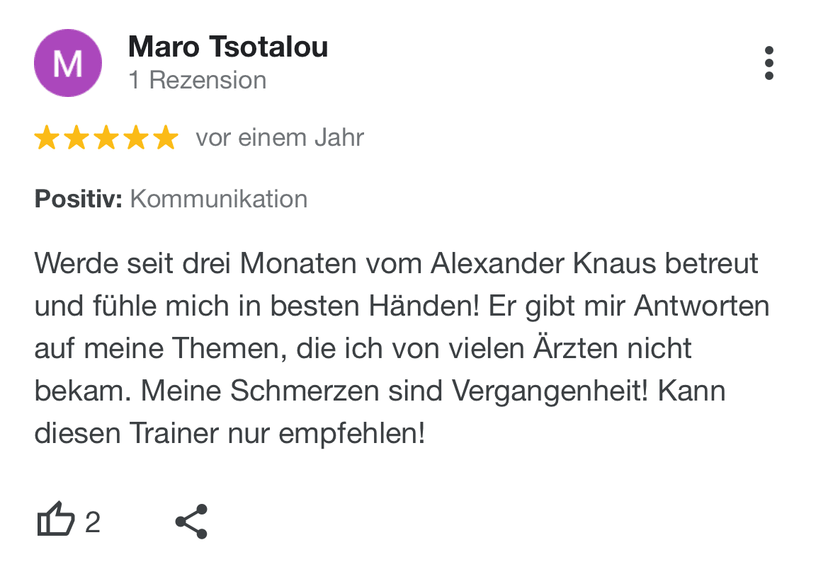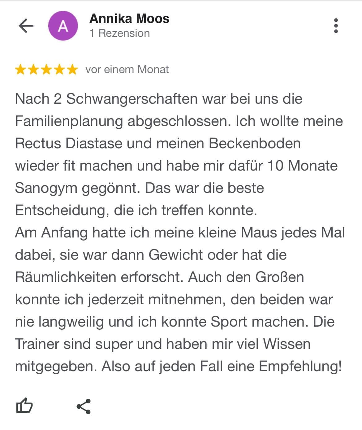 "Ich kann SanoGym jedem empfehlen, der ein orthopädisches Problem hat und seinen Körper mit Spaß und kompetenter Begleitung wieder regenerieren möchte. SanoGym hat mir selbst nach meinem Bandscheibenvorfall geholfen, meine Angst vor Schmerz zu überwinden und meinen Körper wieder selbst in die Hand zu nehmen."